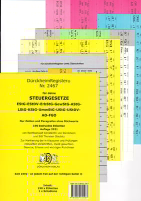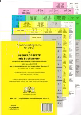EStG, UStG, ErbStG, GewStG, KStG, AO, FGO mit Stichworten aus der amtlichen Überschrift, ca. 213 Etiketten und Schablone zum sauberen Einfügen